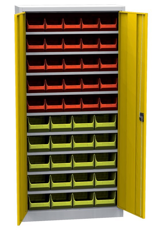 Two-door workshop cabinet with plastic boxes (60), width 750, height 1650, depth 300 mm. 11 x shelves, 36 x Small plastic box (w.110 x h.75 x d.165 mm), 24 x Medium plastic box (w.155 x h.125 x d.240 mm). Possibility of replacing solid doors with doors with glass or wire filling. In stock in light gray body, blue solid doors, blue and red boxes.