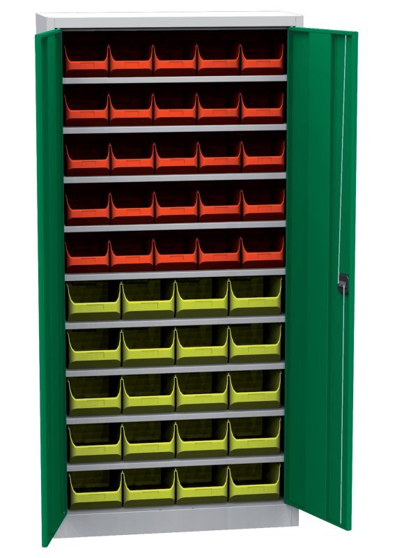 Two-door workshop cabinet with plastic boxes (35), width 800, height 1950, depth 400 mm. 9 x shelves, 20 x plastic box 456209 (w.150 x h.125 x d.235 mm), 15 x plastic box 456214 (w.205 x h.150 x d.352 mm). The possibility of replacing solid doors with doors with glass or wire filling. Body color RAL 7035 light gray.