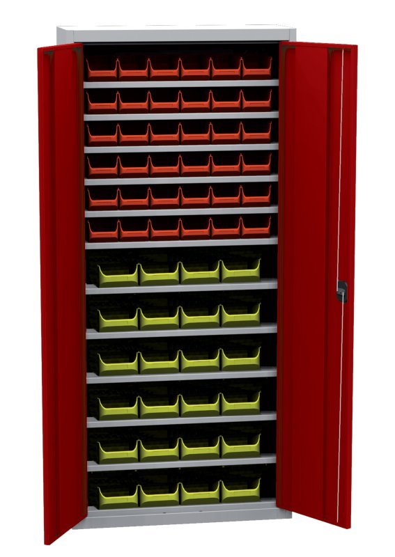 Two-door workshop cabinet with plastic boxes (60), width 750, height 1650, depth 300 mm. 11 x shelves, 36 x Small plastic box (w.110 x h.75 x d.165 mm), 24 x Medium plastic box (w.155 x h.125 x d.240 mm). Possibility of replacing solid doors with doors with glass or wire filling. In stock in light gray body, blue solid doors, blue and red boxes.