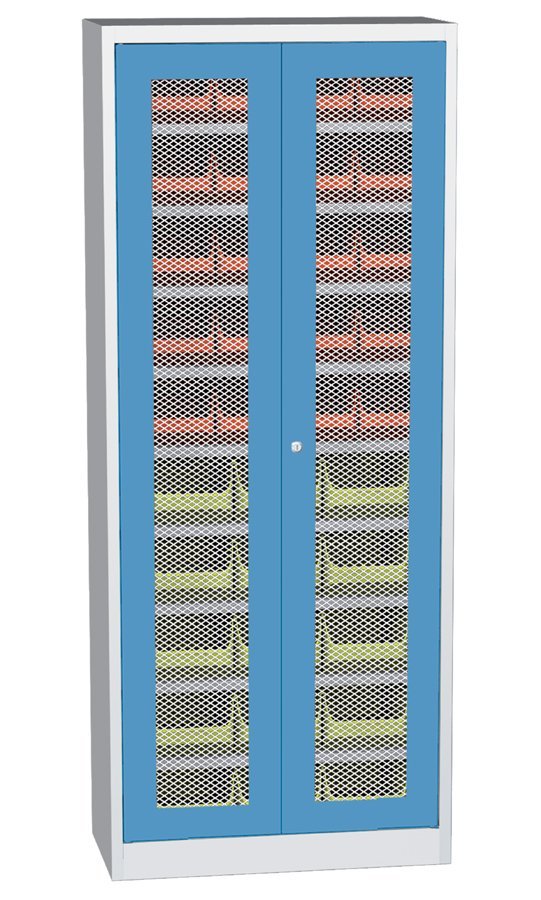 Two-door workshop cabinet with plastic boxes (35), width 800, height 1950, depth 400 mm. 9 x shelves, 20 x plastic box 456209 (w.150 x h.125 x d.235 mm), 15 x plastic box 456214 (w.205 x h.150 x d.352 mm). Wire door in a steel frame. Body color RAL 7035 light gray.