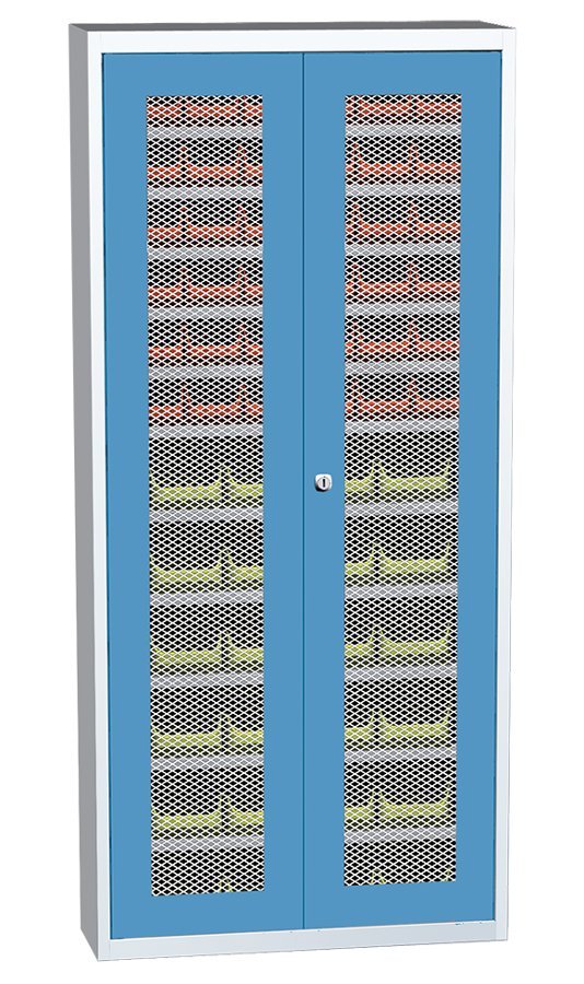 Two-door workshop cabinet, width 750, height 1650, depth 300 mm. 11x shelves. Wire door in a steel frame. Body color RAL 7035 light gray.