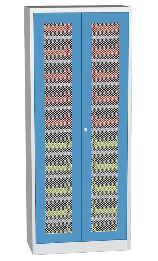 Two-door workshop cabinet with plastic boxes (30), width 800, height 1950, depth 400 mm. 9 x shelves, 15 x plastic box 456213 (w.205 x h.150 x d.355 mm) and 15 x plastic box 456214 (w.205 x h.150 x d.355 mm). Wire door in a steel frame. Body color RAL 7035 light gray.