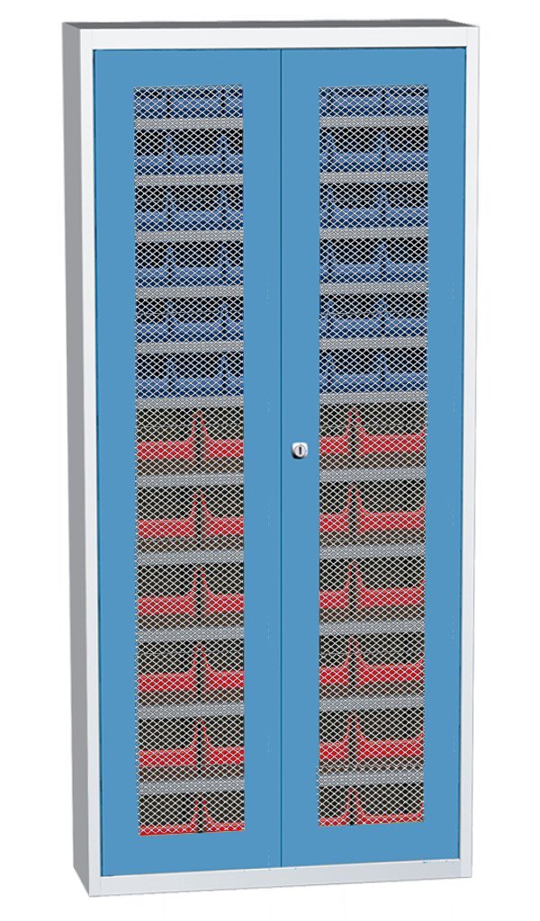 Two-door workshop cabinet with plastic boxes (45), width 950, height 1950, depth 400 mm. 9 x shelves, 25 x plastic box 456209 (w.150 x h.125 x d.235 mm), 20 x plastic box 456214 (w.205 x h.150 x d.352 mm). Possibility of replacing solid doors with doors with glass or wire filling. Body color RAL 7035 light gray.