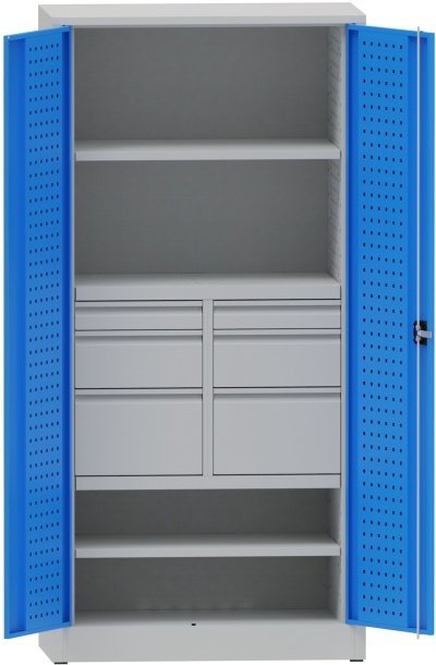 Two-door workshop cabinet, perforated door. Height 1950 x width 950 x depth 500 mm. Three-point pivot lock, 6x drawers, 2x shelves. Body color RAL 7035 light gray, doors RAL 7035 light gray or RAL 5012 blue.