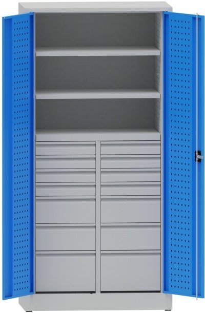 Two-door workshop cabinet, perforated door. Height 1950 x width 950 x depth 500 mm. Three-point pivot lock, 14x drawers, 2x shelves. Body color RAL 7035 light gray, doors RAL 7035 light gray or RAL 5012 blue.