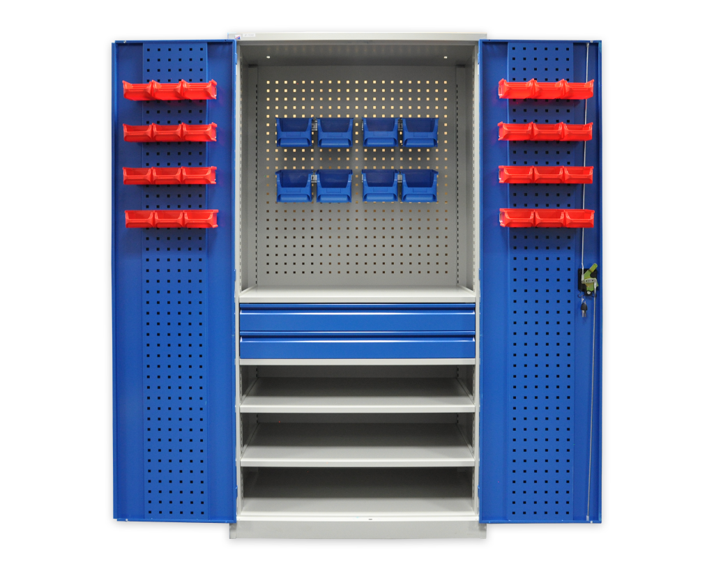 Two-door workshop cabinet with plastic boxes, perforated back (top half) and doors. Height 1850 x width 920 x depth 500 mm. Three-point wheelbase lock, 2x socket. Body color RAL 7044 light gray, door color RAL 5017 blue.