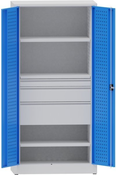 Economy two-door workshop cabinet with perforated panels. Height 1950 x width 950 x depth 500 mm. Three-point wheelbase lock, 3 adjustable shelves, 3 drawers (90% extension). Body color RAL 7035 light gray, doors RAL 7035 light gray, RAL 5005 blue and RAL 5012 blue. In stock in light gray body, blue door RAL 5012.