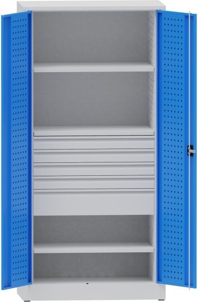 Two-door workshop cabinet, perforated doors. Height 1950 x width 950 x depth 500 mm. Three-point wheelbase lock, 2x shelves, 5x drawer. Body color RAL 7035 light gray, doors RAL 7035 light gray or RAL 5012 blue.