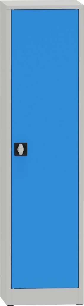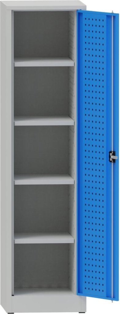 Workshop cabinet, perforated door. Height 1950 x width 500 x depth 500 mm. Three-point wheelbase lock, 4x shelves. Body color RAL 7035 light gray, doors RAL 7035 light gray or RAL 5012 blue.