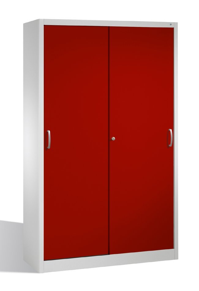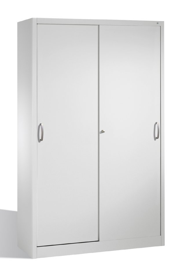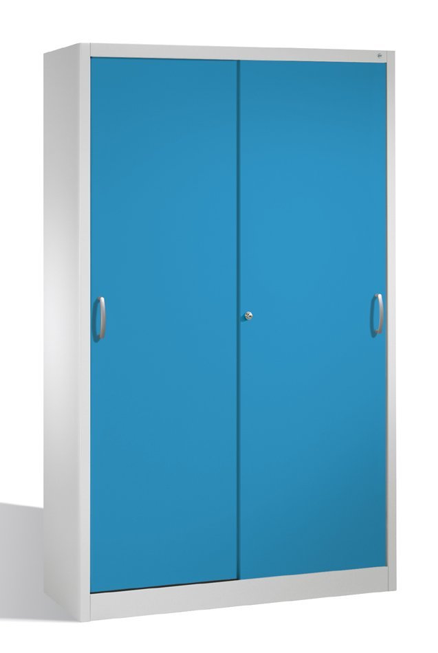 Workshop cabinet with durable steel construction and sliding doors. 4 adjustable galvanized shelves. Load capacity 70 kg/shelf. Body color light gray RAL 7035, door color of your choice. Cylindrical safety lock. Dimensions in mm (H x W x D) 1950 x 1200 x 400.