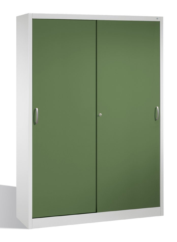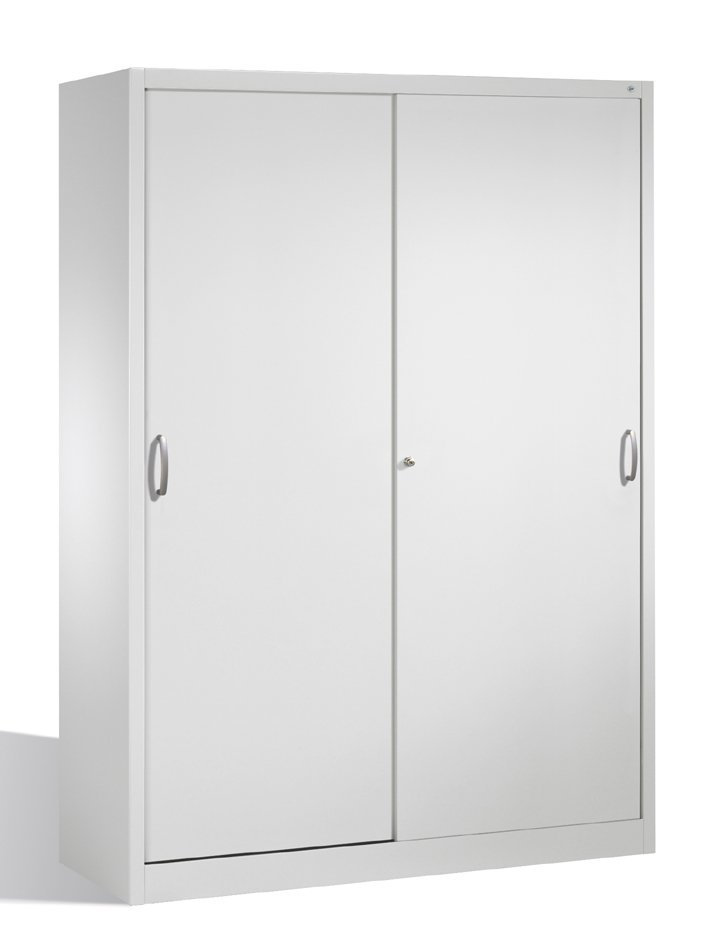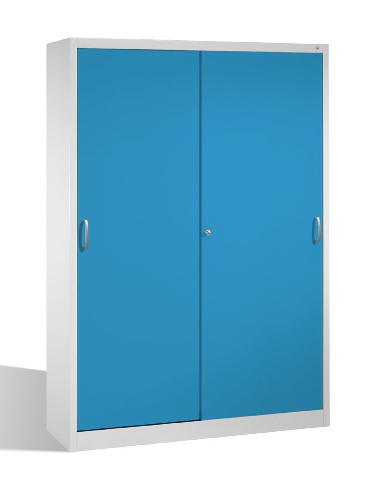 Workshop cabinet with durable steel construction and sliding doors. 8 adjustable galvanized shelves. Load capacity 70 kg/shelf. In the middle of the crossbar. Body color light gray RAL 7035, door color of your choice. Cylindrical safety lock. Dimensions in mm (H x W x D) 1950 x 1600 x 400. Delivery within 15 days.