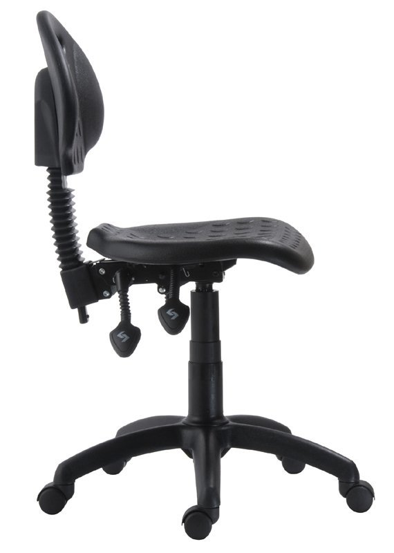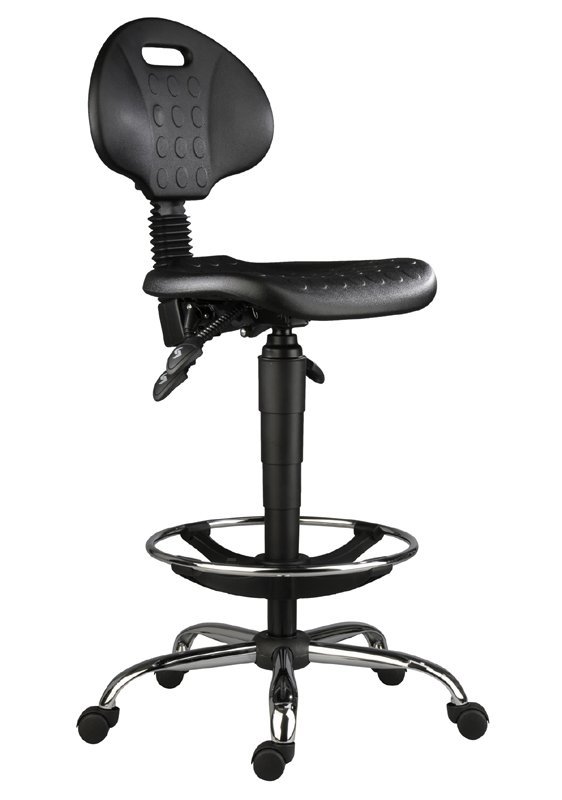 Polyurethane workshop chair, adjustable backrest angle, adjustable backrest height and seat depth, gas piston. Wheels or gliders, the possibility of elevated seating with a circular footrest. Plastic or chrome cross. Price without armrests.