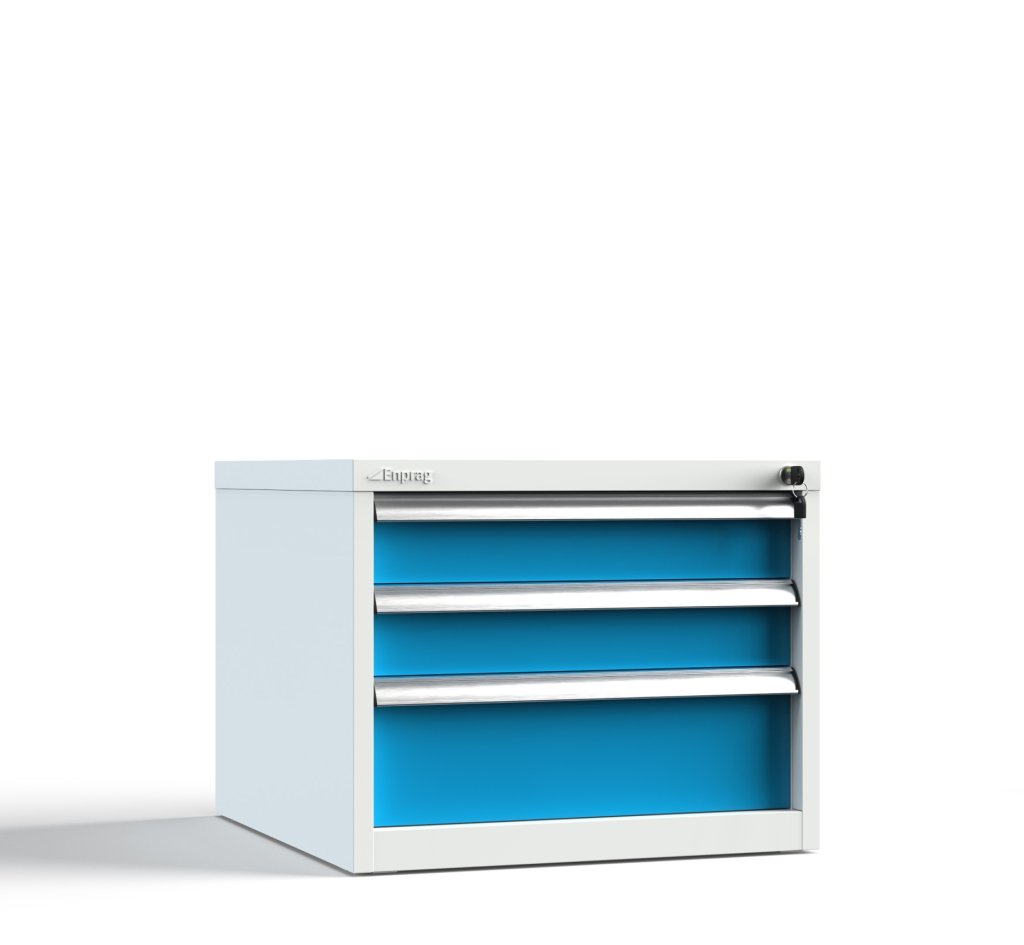 Hanging container for work table, height 450, width 565, depth 580 mm. Body color RAL 7035, door color RAL 5015.