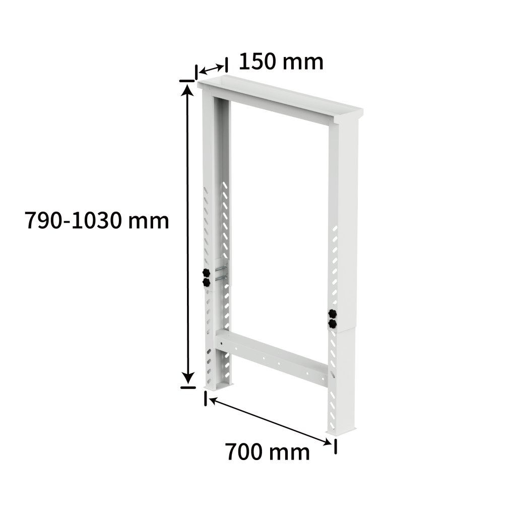 Worktop 40 mm waterproof beech joint. Leg height 790 -1030, width 150, depth 699 mm. Suspended container with three drawers, height 450, width 565, depth 580 mm. The table has a load capacity of 500 kg, height 830 - 1070, width 1500, depth 750 mm, construction color light gray RAL 7035, drawer color RAL 5012.