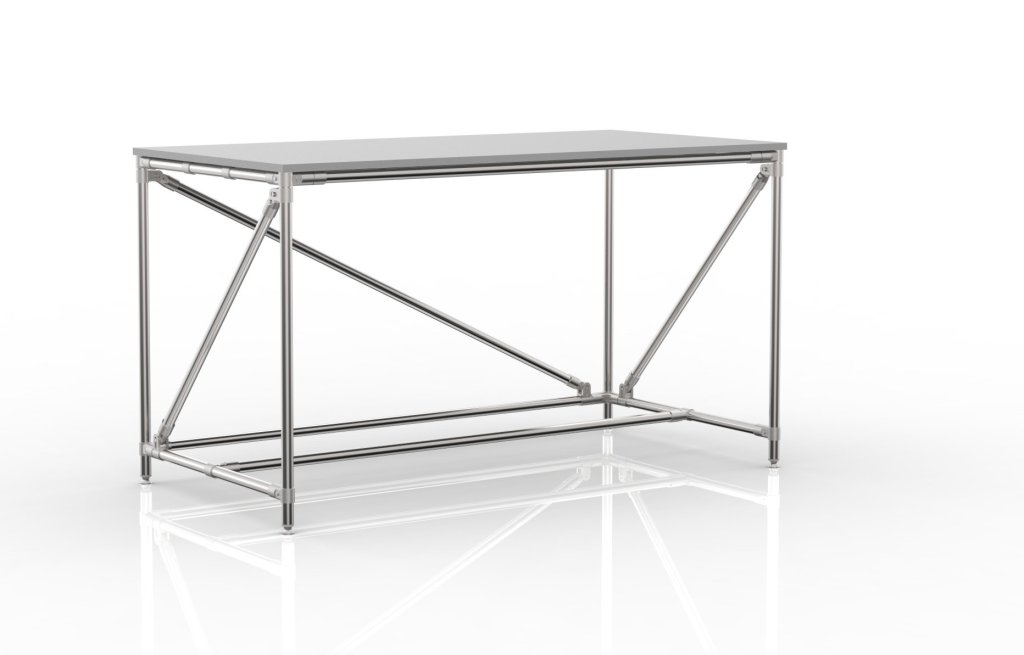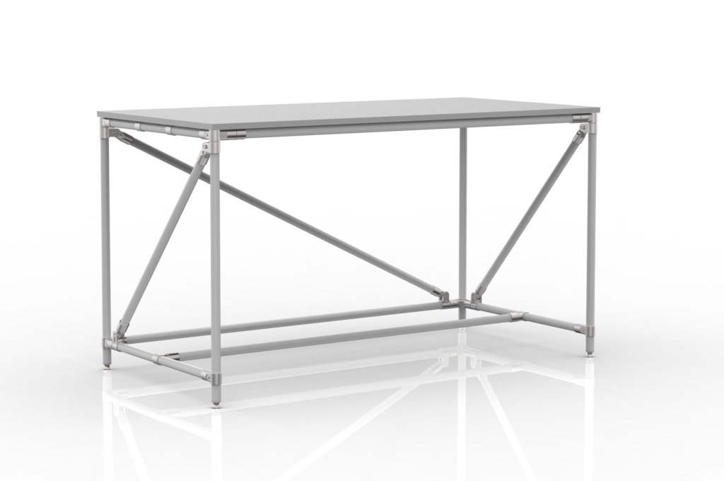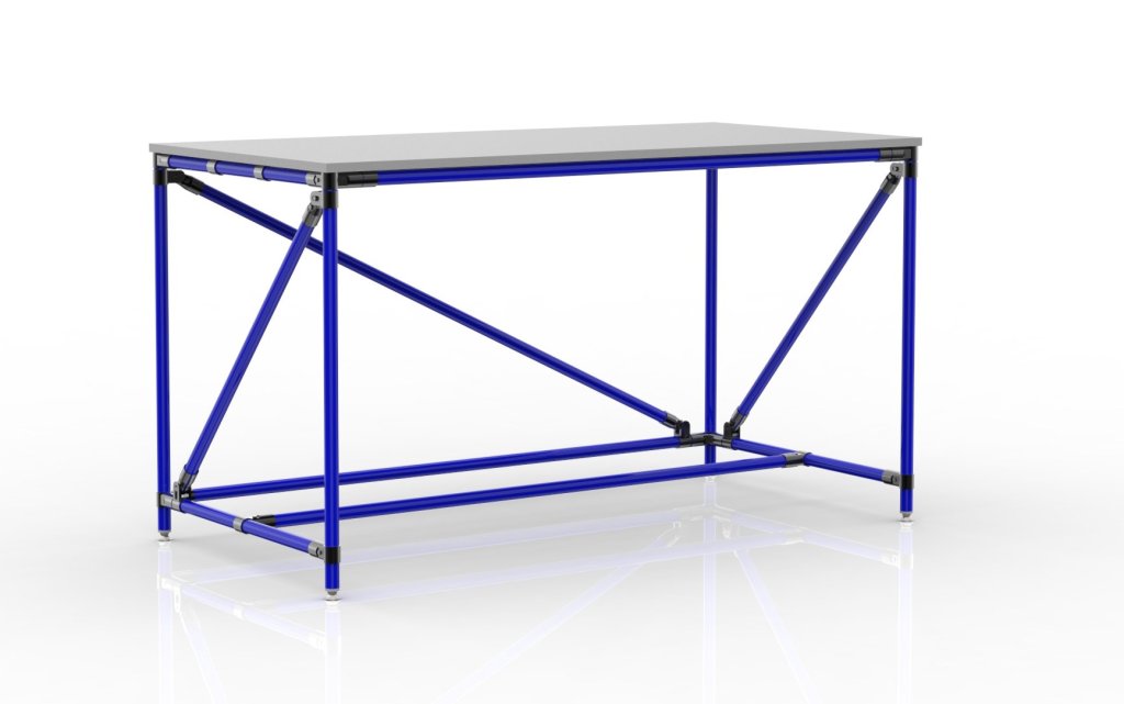 Workshop table from a tubular modular system. The table includes a double-sided laminated worktop and four adjustable legs. Load full description and parameters
