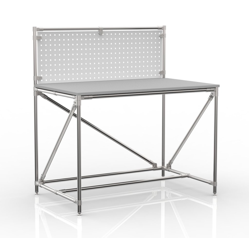 Workshop table with perforated panel from the tubular modular system. The table includes a laminate worktop, a perforated panel full description and parameters