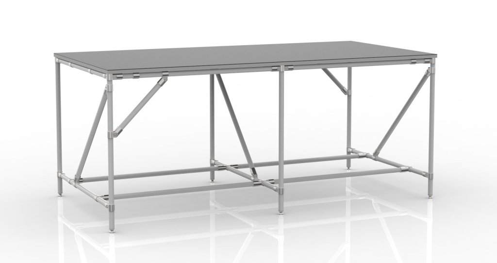 Work table made of tubular modular system with DTDL worktop 18 mm thick and with anti-slip layer 3 mm thick. The table provides full description and parameters