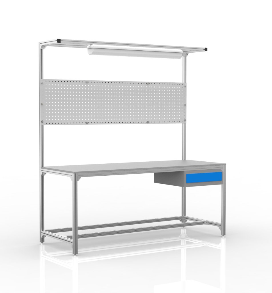 Workshop table made of aluminum profiles. The table includes a laminate board, a table container with one drawer, a perforated panel for hanging boxes or tools, LED lighting and height-adjustable legs. Thanks to the use of aluminum profiles, the table is light but at the same time highly strong. Load capacity with a uniform load of 150 kg. Dimensions 2200 x 2000 x 790 mm.