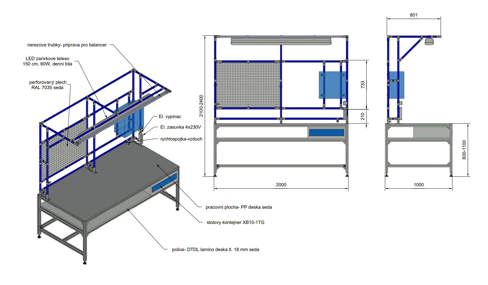 Workshop table made of aluminum profiles with a drawer unit and a tube system extension offers organized workspace and full description and parameters
