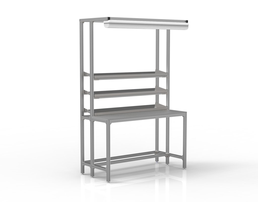 Height-adjustable antistatic table from a tubular modular system. The table is equipped with an ESD laminate board with a thickness of 19 mm, which provides reliable protection against electrostatic charges. Also included is an ESD container, an ESD punch panel, illumination and an aluminum plate with an A4 clip that allows you to keep important documents close at hand. Load capacity with a uniform load of 150 kg. The table has an adjustable height in the range of 650 – 950 mm. Dimensions 2100 x 1500 x 700 mm.