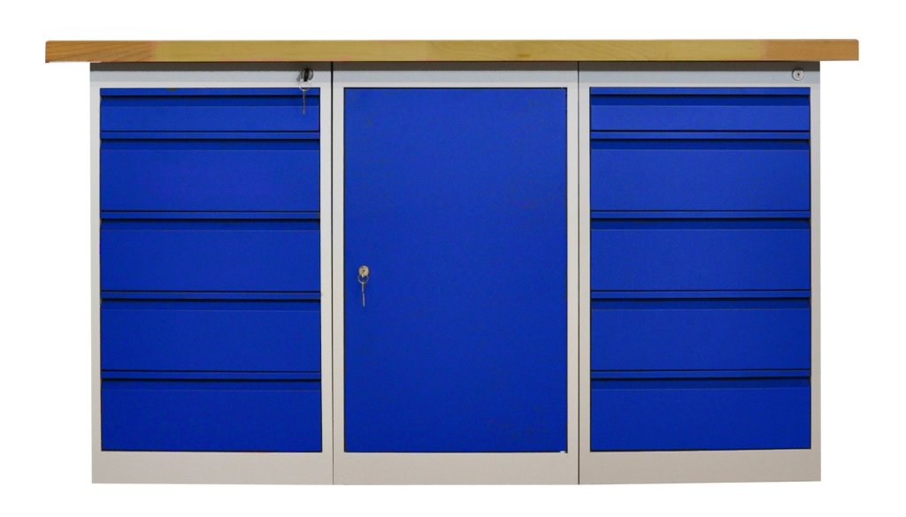 Worktop 40 mm waterproof beech joint. 3x pedestal container, height 810, width 461, depth 600 mm. The table has a load capacity of 500 kg, height 850, width 1500, depth 750 mm, container color gray RAL 7035/blue RAL 5010. The door can be placed on both sides. The shelves are removable but not adjustable.