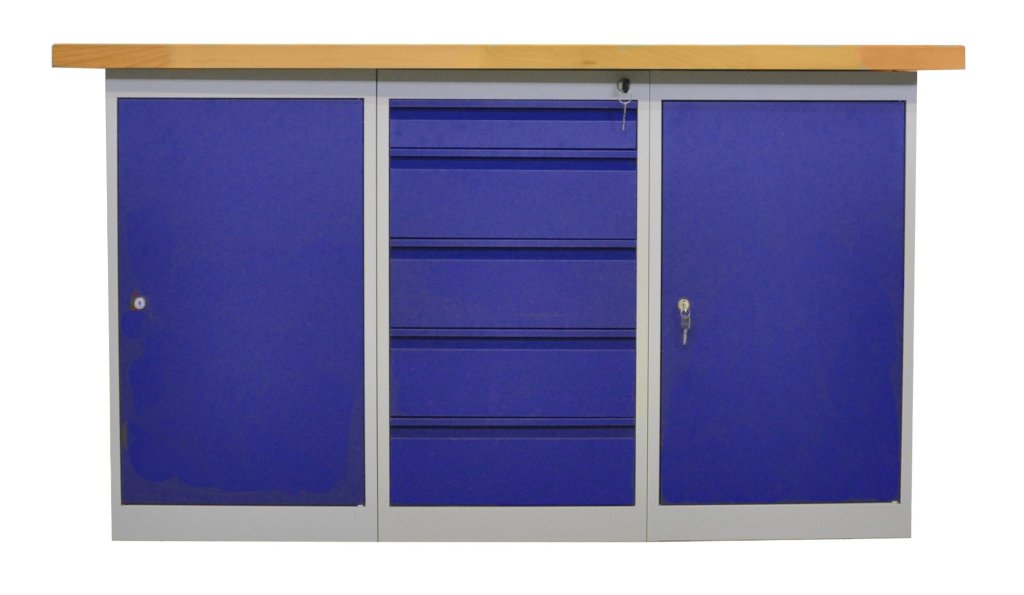 Worktop 40 mm waterproof beech joint. 3x pedestal container, height 810, width 461, depth 600 mm. The table has a load capacity of 500 kg, height 850, width 1500, depth 750 mm, container color gray RAL 7035/blue RAL 5010. The door can be placed on both sides. The shelves are removable but not adjustable.