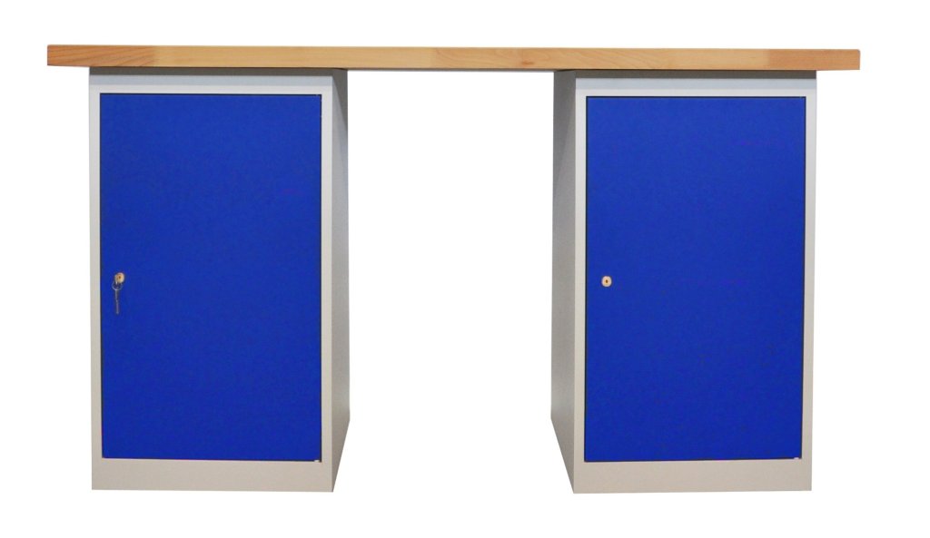 Worktop 40 mm waterproof beech joint. 2x pedestal container, height 810, width 461, depth 600 mm. The table has a load capacity of 500 kg, height 850, width 1500, depth 750 mm, container color gray RAL 7035/blue RAL 5010.