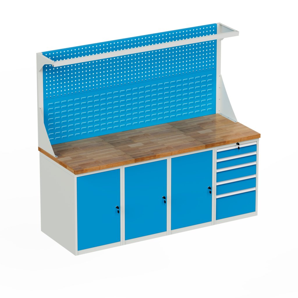 Worktop 40 mm waterproof beech joint. 4x base container, height 810, width 500, depth 700 mm. The table has a load capacity of 500 kg, height 850, width 2050, depth 750 mm, container color gray RAL 7035/blue RAL 5012.