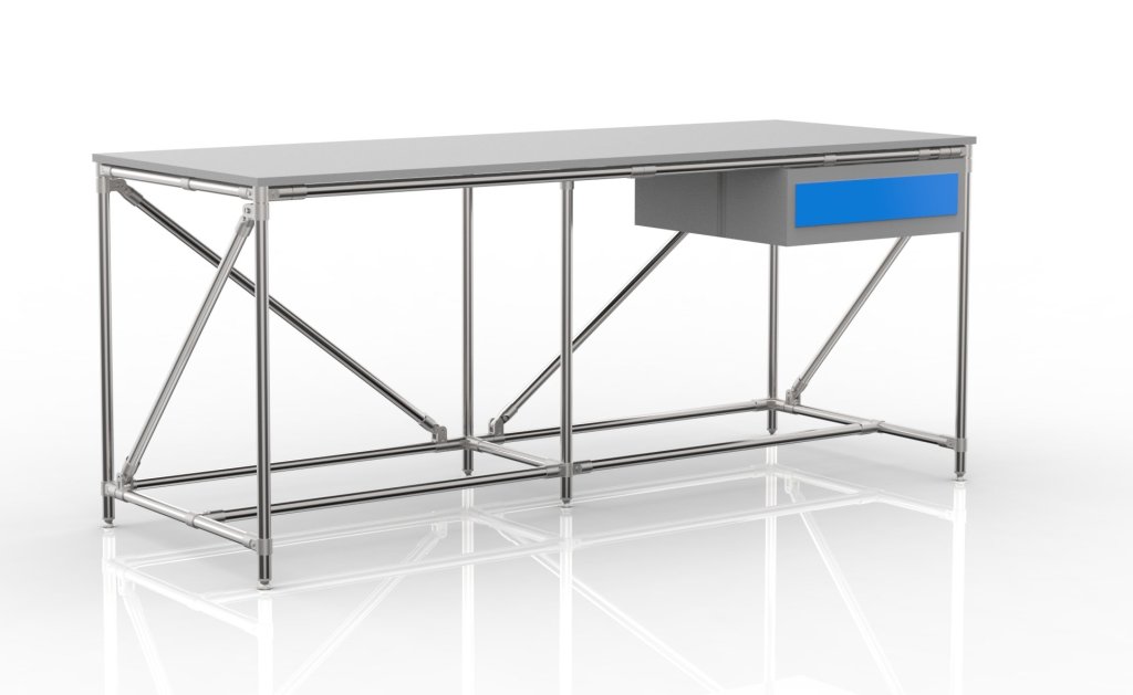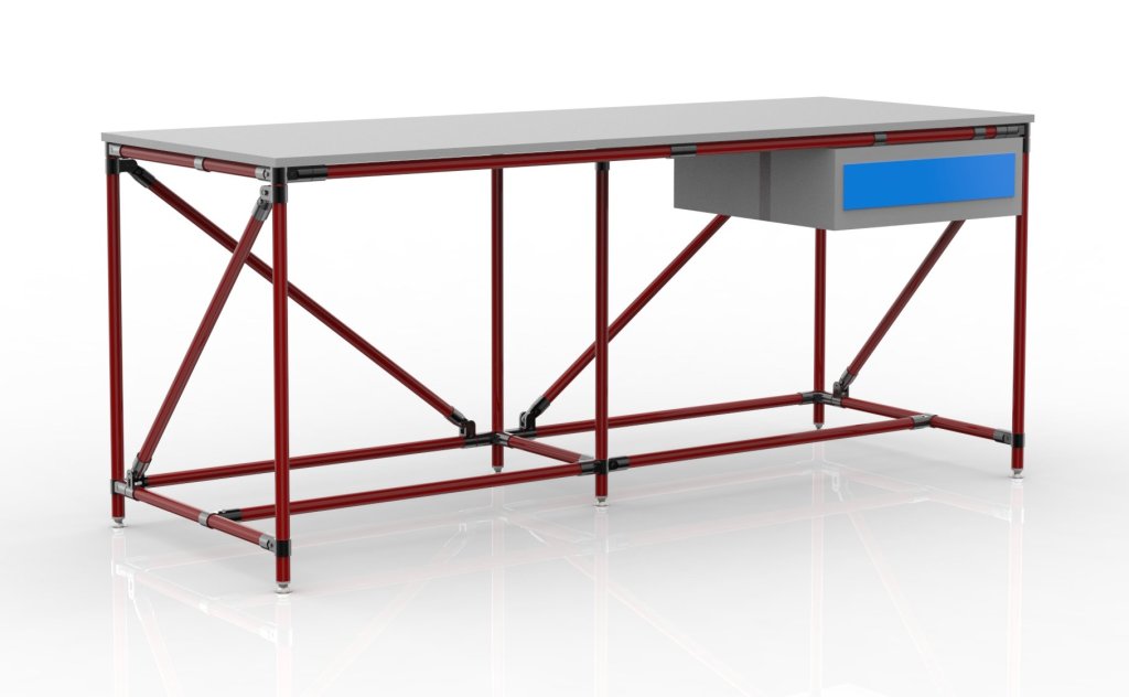 Workshop table made of tubular modular system with DTDL worktop 18 mm thick, table container with one drawer and four adjustable legs. Load capacity with a uniform load of 100 kg. Dimensions 850 x 2000 x 750 mm.