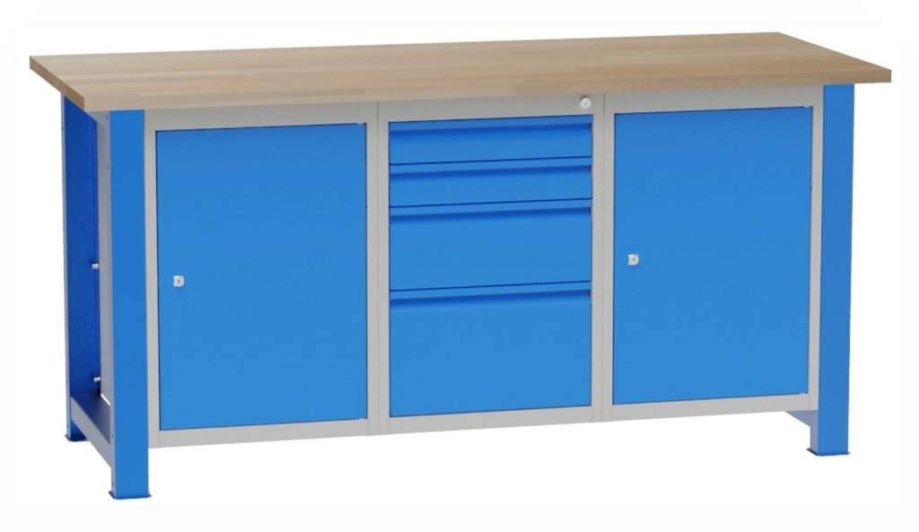 Worktop 27/40 mm waterproof beech joint. Leg height 800, width 2100, depth 700 mm. 2x base container with drawers (4x drawer + 1x door), height 800, width 480, depth 610 mm. The table has a load capacity of 500 kg, height 827/840, width 2100, depth 700 mm, leg color blue RAL 5012, container color gray RAL 7035/blue RAL 5012.
