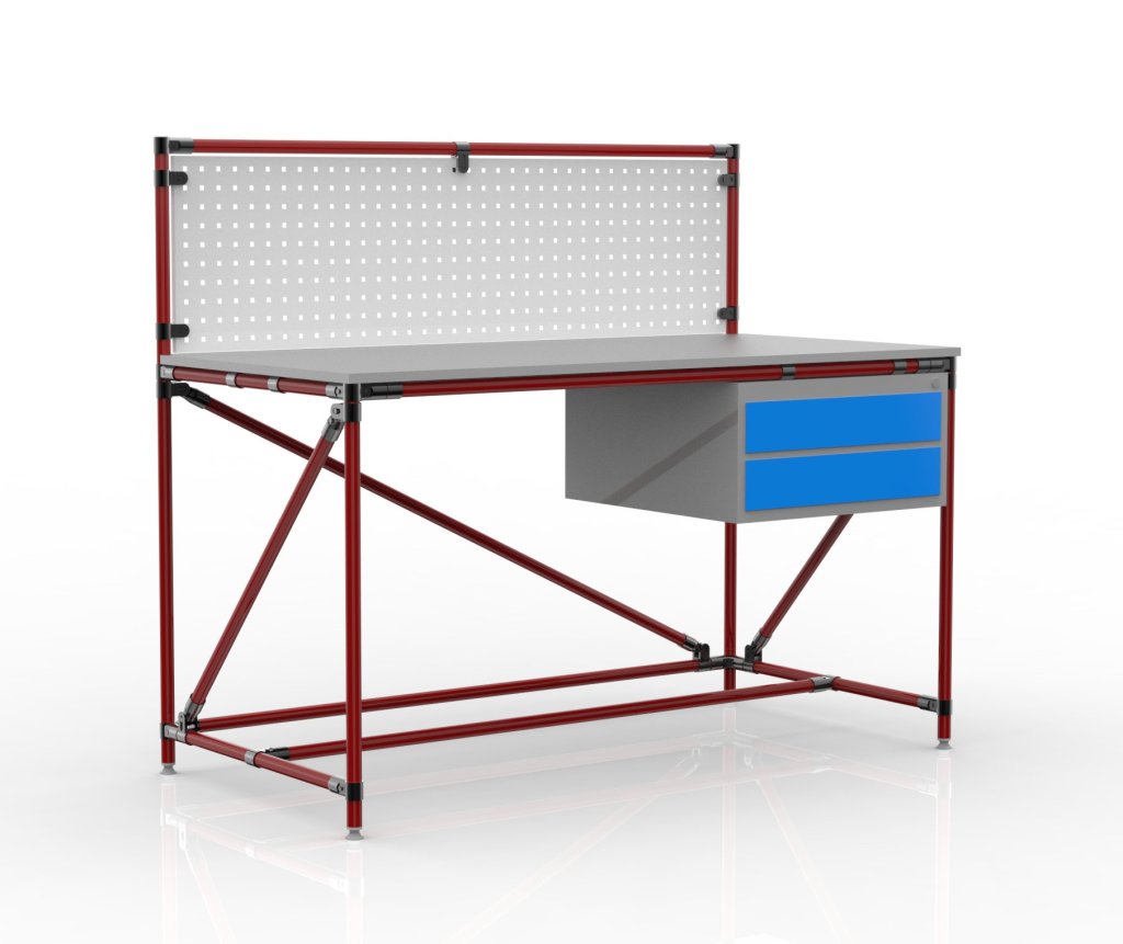 Workshop table with perforated panel from the tubular modular system. The table includes a chipboard worktop laminated on both sides with a thickness of 18 mm, a table container with two drawers, a perforated panel for hanging tools or boxes and four adjustable feet. Load capacity with a uniform load of 100 kg. Dimensions 1282 x 1500 x 750 mm.
