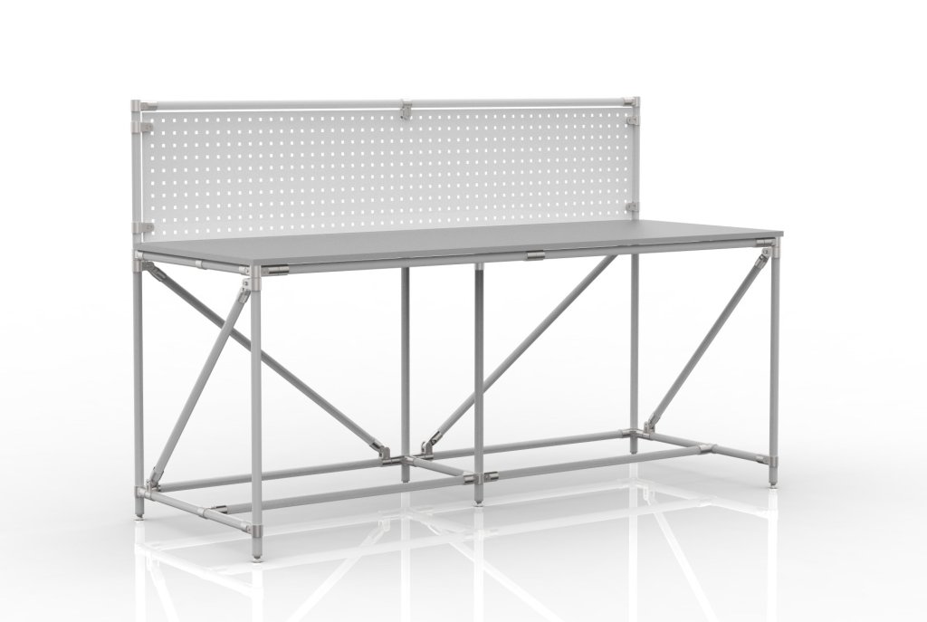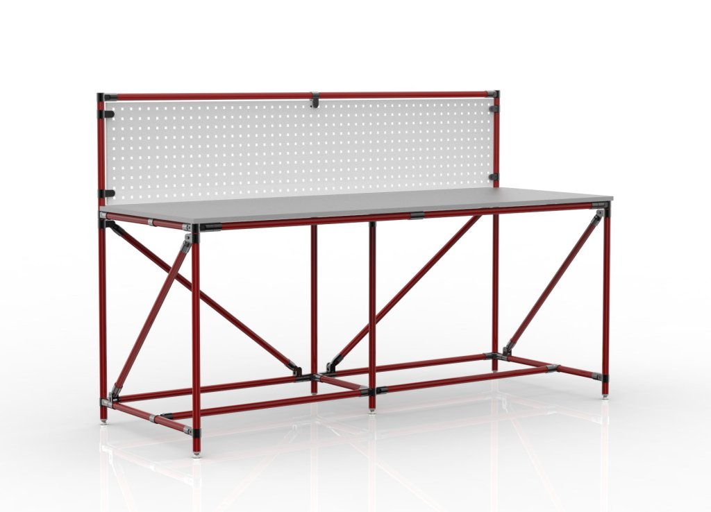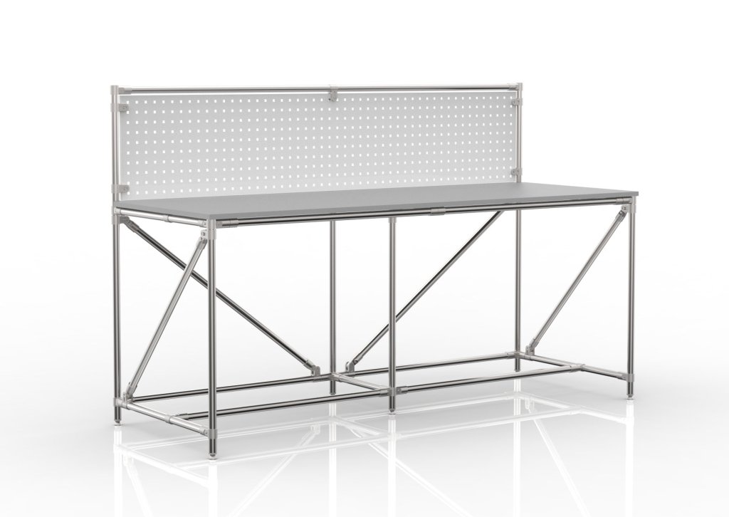 Workshop table with perforated panel from the tubular modular system. The table includes a chipboard worktop laminated on both full description and parameters