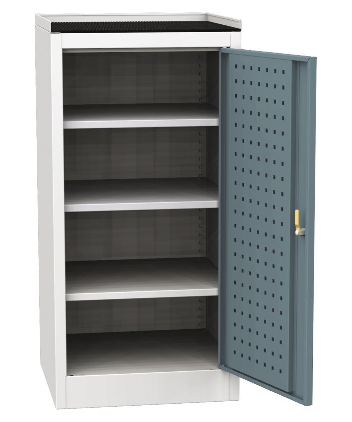Workshop tool box, width 500, height 1030, depth 500 mm. Upper storage area with a rubber pad and an edge to prevent small objects from falling through. Body color gray RAL 7035. In stock in door color blue RAL 5012.