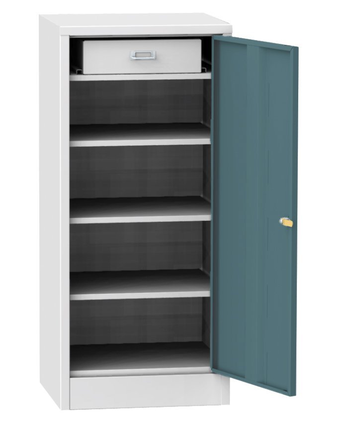 Workshop tool box, width 500, height 1030, depth 500 mm. Upper storage area with a rubber pad and an edge to prevent small objects from falling through. Body color gray RAL 7035. In stock in door color blue RAL 5012.