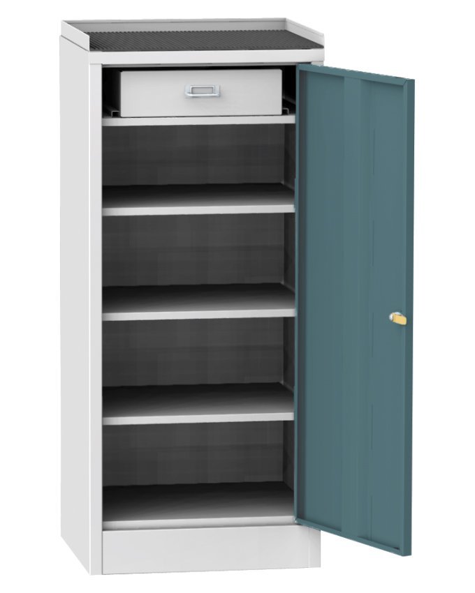 Workshop tool box, width 500, height 1030, depth 500 mm. Upper storage area with a rubber pad and an edge to prevent small objects from falling through. Body color gray RAL 7035. In stock in door color blue RAL 5012.