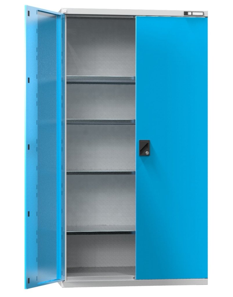 Cabinet with hinged doors, 4 x shelves adjustable in 25mm increments (galvanized), full door with reinforcements for perfo, load capacity 600 kg. Height 1950 x width 1044 x depth 655 mm. In stock in body color gray RAL 7035, door blue RAL 5012.
