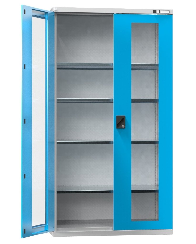 Cabinet with wing doors, 4 x shelves adjustable in 25mm increments (galvanized), glass doors in a steel frame, load capacity 600 kg. Height 1950 x width 1044 x depth 655 mm.
