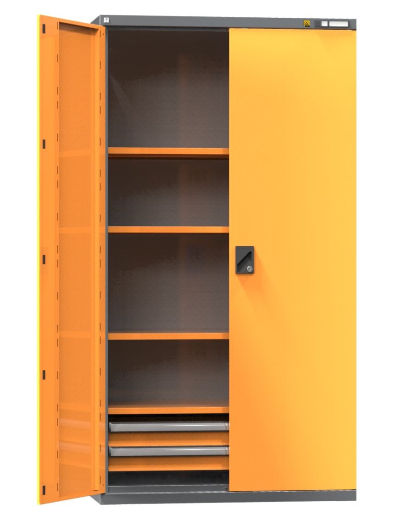 ESD cabinet with wing doors, 4x ESD shelves adjustable by 25 mm, 2x 100E drawer, full door with reinforcements for perfo, load capacity 600 kg. Height 1950 x width 1044 x depth 655 mm.