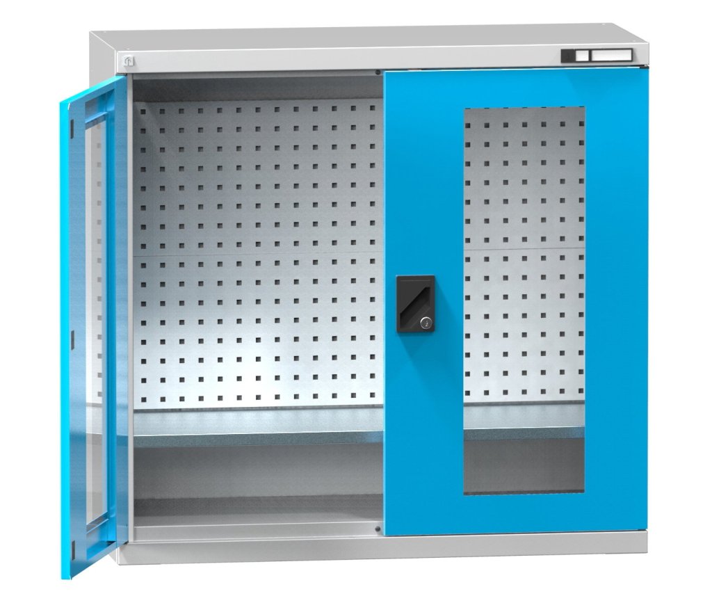 Cabinet with wing doors, 1 x shelf adjustable in 25 mm increments (galvanized), glass door in a steel frame. Perforated panels of side walls and back (2 sets each), load capacity 300 kg. Height 1000 x width 1044 x depth 405 mm.