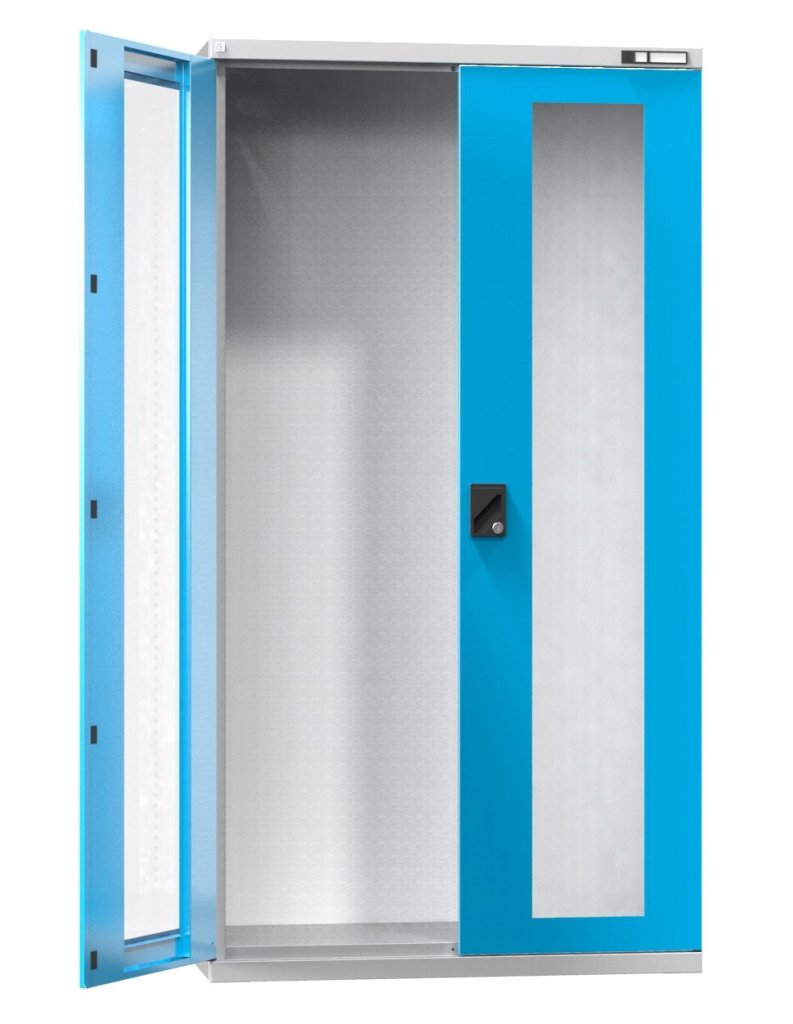 Cabinet with wing doors, glass doors in a steel frame, load capacity 600 kg. Height 1950 x width 1044 x depth 405 mm.