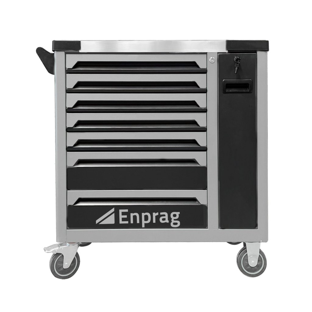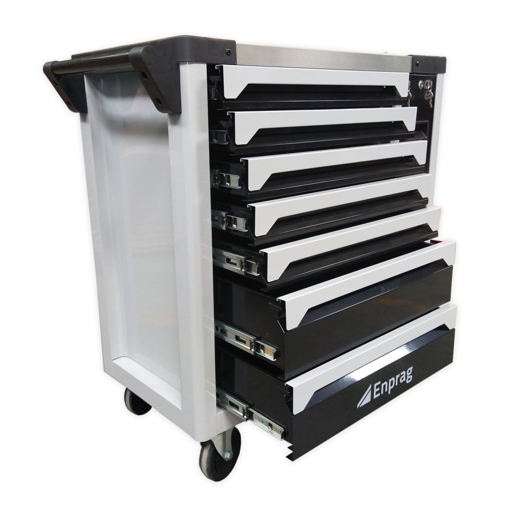 Workshop service trolley - 8x drawer. Height 951 x width 954 x depth 459 mm. 2 swivel and 2 fixed castors, handle. Color grey RAL 7040 / black RAL 9017.