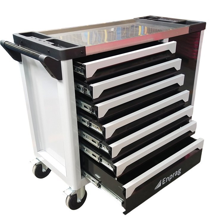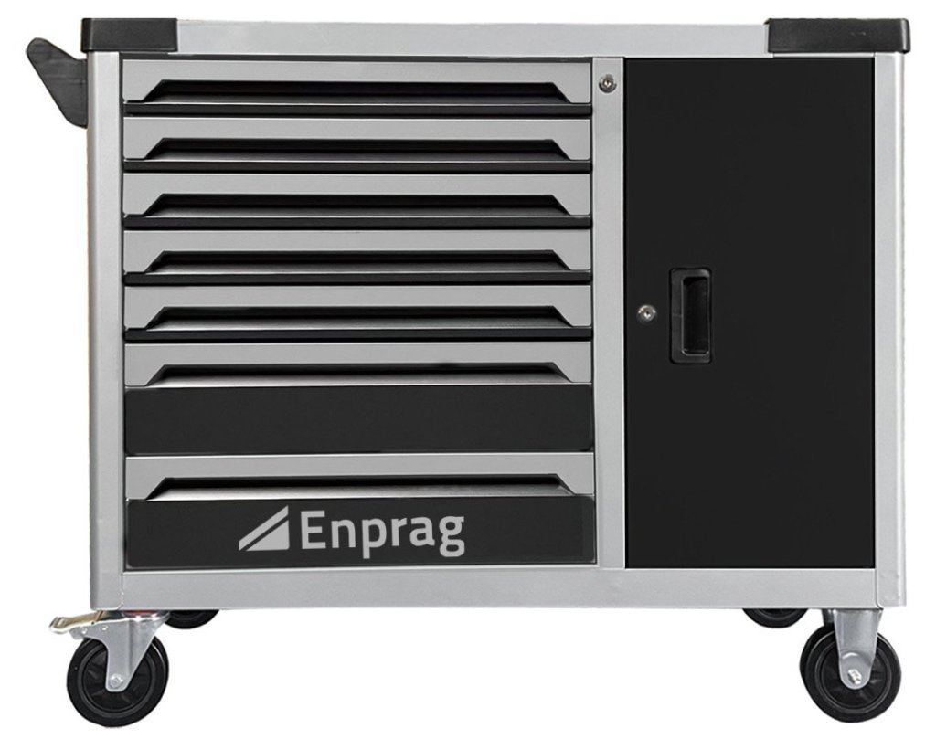 Workshop service trolley - 7x drawer. Height 951 x width 954 x depth 459 mm. 2 swivel and 2 fixed castors, handle. Color grey RAL 7040 / black RAL 9017.