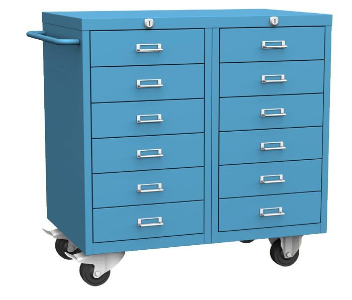 Workshop service cart, twelve-drawer mobile container, height 725, width 700, depth 450 mm.