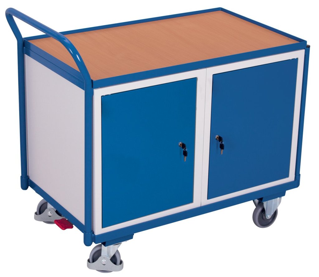 Workshop trolley with two cabinets with solid doors. Made of steel profiles. Work surface made of beech plywood. Color RAL 7035 light gray, handle, structure, front side - powder color RAL 5010 blue. Castors 2 swivel with Easy Stop central brake, 2 fixed. Height 1010 mm, width 1125 mm, depth 625 mm.