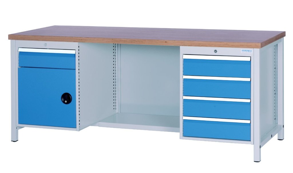 Workshop workbench - dimensions (H x W x D) 859 x 2000 x 750 mm. Worktop beech multiplex 40 mm, 1x steel shelf in the middle, 4x drawers on the right, 1x drawer + door on the left. The color of the structure is light gray, the color of the drawers and doors can be chosen. Total load capacity 1200 kg. Supplied assembled.
