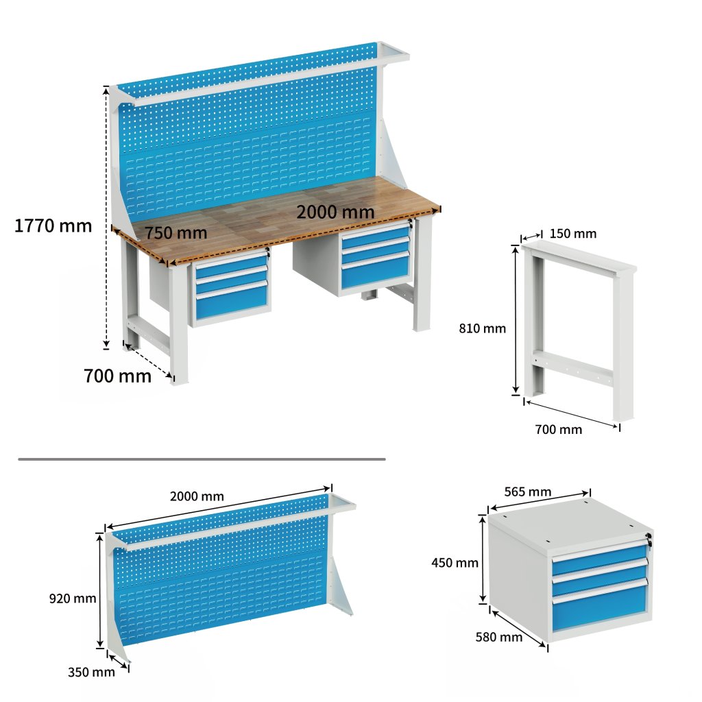Worktop 40 mm water‑resistant beech veneer. Leg height 810 mm, width 150 mm, depth 699 mm. 2x uspended container with three drawers height 450 mm, width 565 mm, depth 580 mm. Table extension with perfopanels height 920 mm, width 2000 mm, depth 350 mm. Table load capacity 500 kg, worktop height 850 mm, total height with extension 1770 mm, width 2000 mm, depth 750 mm. Frame colour light‑grey RAL 7035, drawers & perfopanel colour blue RAL 5012.