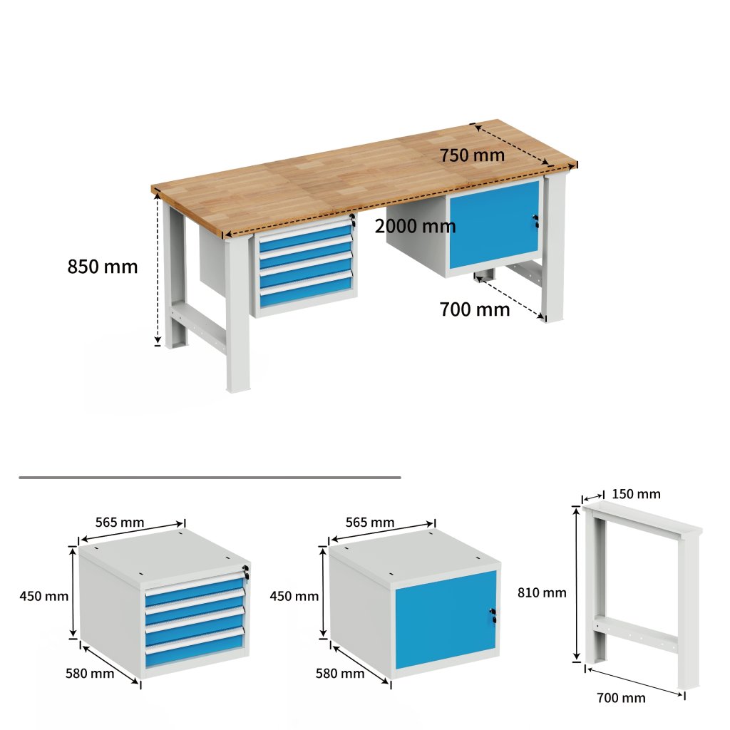 Worktop 40 mm waterproof beech joint. Leg height 810, width 150, depth 699 mm. Suspended container and suspended container with four drawers, height 450, width 565, depth 580 mm. The table has a load capacity of 500 kg, height 850, width 2000, depth 750 mm, construction color light gray RAL 7035, drawer and door color RAL 5012.