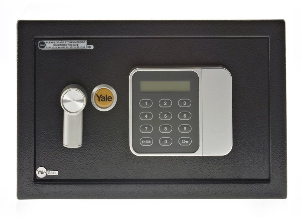 Yale Guest Small furniture safe, electronic code locking, blue backlit display, lever double-sided locking system. Height 200 x width 310 x depth 200 mm, internal dimensions 197 x 307 x 137 mm.