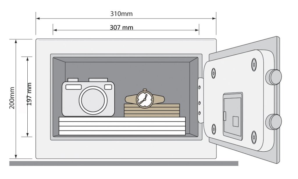 Yale Value Small furniture safe, electronic code locking, without display, lever double-sided locking system. Height 200 x width 310 x depth 200 mm, internal dimensions 190 x 300 x 150 mm.