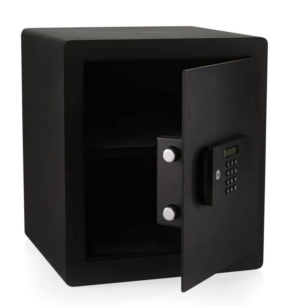 Yale High Security furniture safe with automatic door opening. Electronic code locking with the possibility of emergency opening using a key with a double profile. Height 400 x width 350 x depth 340 mm, weight 17 kg, volume 38.5 l.